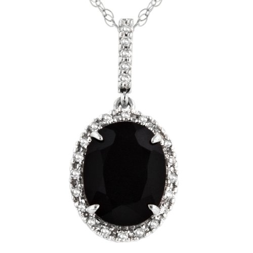 Add drama to any outfit with this elegant gemstone pendant. Crafted in sterling silver, it highlights a black sapphire oval, cradled in a four-prong setting and surrounded by a decorative beadwork border with genuine diamond accents. A slim bead-textured bail joins the pendant to an 18-inch sterling silver rope chain.