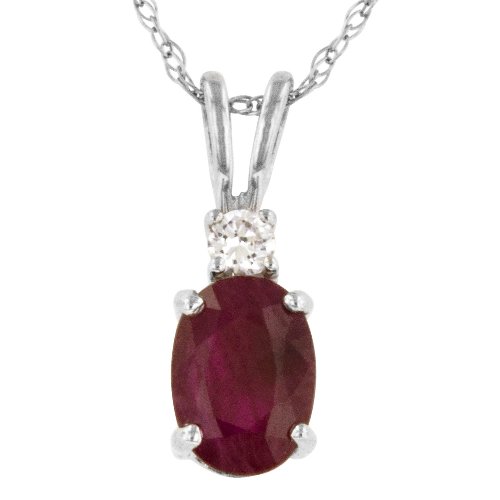 This dainty sterling silver gemstone pendant highlights a faceted oval of violet-red ruby, topped with a diamond accent. The stones are mounted in four-prong settings beneath an elegant split bail, and the pendant is suspended from an 18-inch sterling silver rope chain. The enchanting ruby, known as "king of the gems," is the birthstone for July and a gemstone long associated with passion, love, and romance.