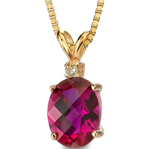 Gemstones: Lab Created Ruby, Oval Shape, 8x6mm, 1.50 carats. Ruby is top Gem quality with Intense Color and Brilliance. 1 pieces Sparkling Diamonds total weight of 0.03 carats accent the pendant. Retails for $199.99. Pendant weighs 1.00 grams. Pendant's dimension is 1/4 x 5/8 inches. Pendant is in 14 Karat pure gold and bears the 14kt stamp. Includes Gift Box and Free Shipping. Chain is not included. Sku# P8342
