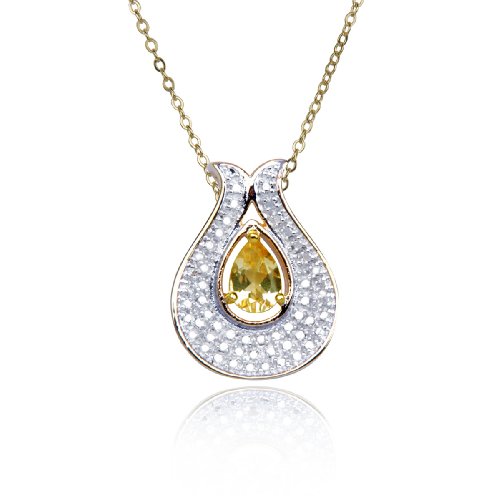 Shimmering diamond accents and silver bead texturing shape a fancy teardrop frame around a single pear-shaped citrine gemstone in this beautiful pendant. It's crafted in gold-dipped sterling silver and presented on an 18-inch cable chain. Golden citrine is November's birthstone, and a versatile gemstone for any season.