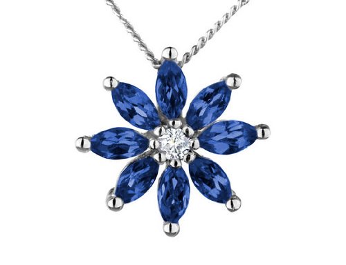 This stunning gemstone pendant features eight magnificent marquise cut sapphires set in gleaming 10 karat white gold. The richly glowing gemstones are crafted into an exquisite flower with a sparkling diamond center. SKU: 02ES45165SAW